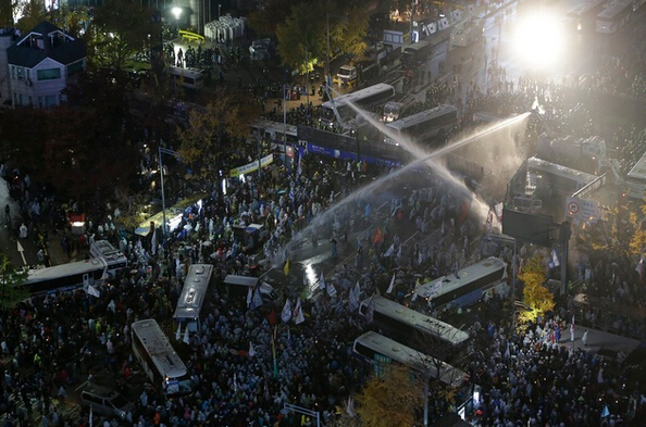 下午4時30分許,示威者開始向光化門廣場方向游行,向青瓦臺總統府前進,遭到警方阻攔。警方此前并未批準光化門廣場集會申請,2.2萬名警力和700多輛警用大巴連結成封鎖線,堵住這條通往總統官邸的要道及其他一些道路,阻止示威者前進。