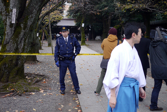 11月23日,在日本东京,警察在靖国神社爆炸地点附近警戒。