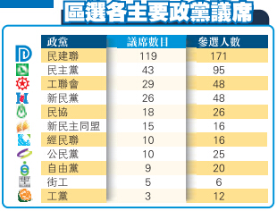 另外,反对派阵营中,新民主同盟的16个候选人中15人当选,比上一届多出7席,范围全都集中於新界东及新界西,其他地区仍然是零。新同盟昨午总结选举结果时表示,未来会设立新系统协助党内新上任的区议员做好地区工作。
