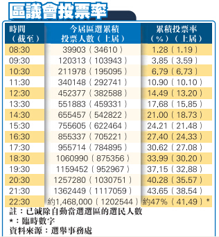 2015年区议会选举投票前日结束,经过6个多小时的通宵点票,全港431个议席的选举结果终於出炉。在全港369万名合资格选民中,共有146.7万人投票,投票率高达47%,不仅较上届多出5%,更超越2003年的44.1%,创下历史新高。以往高投票率对反对派较为有利,惟今次选举显示,选民普遍对反对派发动、组织违法「占领」持反感态度,倾向支持作风务实的建制派候选人。