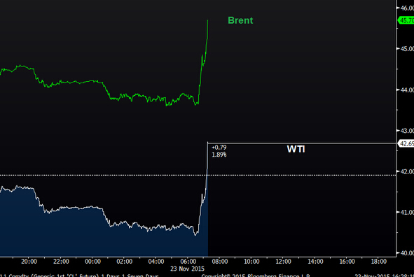 受沙特維穩油價消息刺激歐洲時段國際油價觸底反彈沖高,因沙特準備出手穩定原油市場,北京時間20:00,美原油1月期貨短線拉升逾2美元至42.75美元/桶,日內漲跌幅由下跌3%轉為上漲2%;布倫特原油1月期貨短線拉升逾2美元至45.72美元/桶,K線一度由綠翻紅。