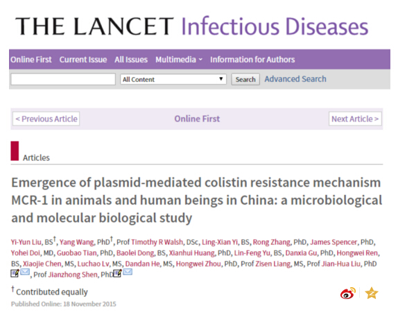 從2011年至2014年,研究人員從中國屠宰場的豬、農貿市場和超市販售的豬肉和雞肉中采集了細菌樣本,并分析了廣東和浙江兩所醫院患者身上的病菌。結果發現,從動物和生肉中采集的大腸桿菌樣本中,MCR-1基因出現率很高,且陽性樣本比例逐年升高;在1322個患者身上采集的大腸桿菌和肺炎克氏桿菌樣本中,也有16個樣本含有MCR-1基因。