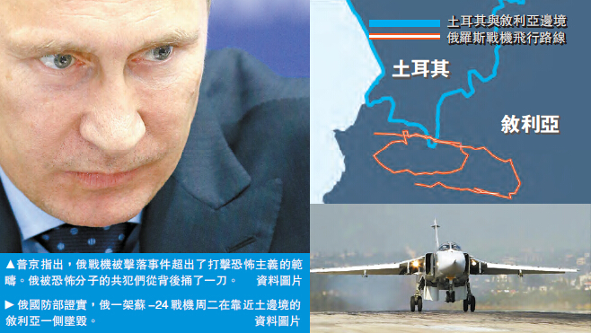 俄總統普京當日發表講話說,我們的飛機是在敘領空被擊落的,而且是被空對空導彈擊落的。普京指出,不能容忍像今天軍機被擊落這樣的罪行。墜機事件將沖擊俄土關系,將給兩國關系造成嚴重影響。俄戰機被擊落事件超出了打擊恐怖主義的範疇。俄被恐怖分子的共犯們從背后捅了一刀。