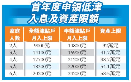 张建宗表示,「低津」将於下年5月3日起接受4人或以上家庭申请、6月接受3人家庭申请,以及於7月接受2人家庭申请。首轮申请的申领期均以今年11月起计,以后申领期将会划一为6个月。至於条件方面,2人家庭的全额津贴入息上限为9000元,半额为10800元,4人家庭的全额津贴入息上限为17700元,半额为21200元。