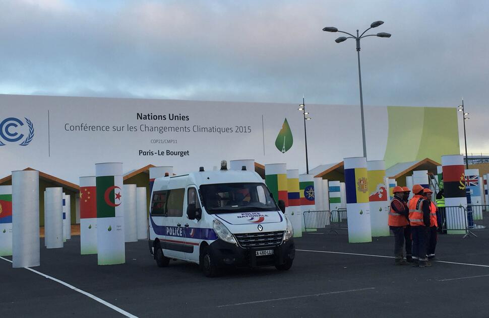 11月23日,一輛警車停在巴黎氣候變化大會會場的各國圓柱前。(新華社記者 應強 攝)