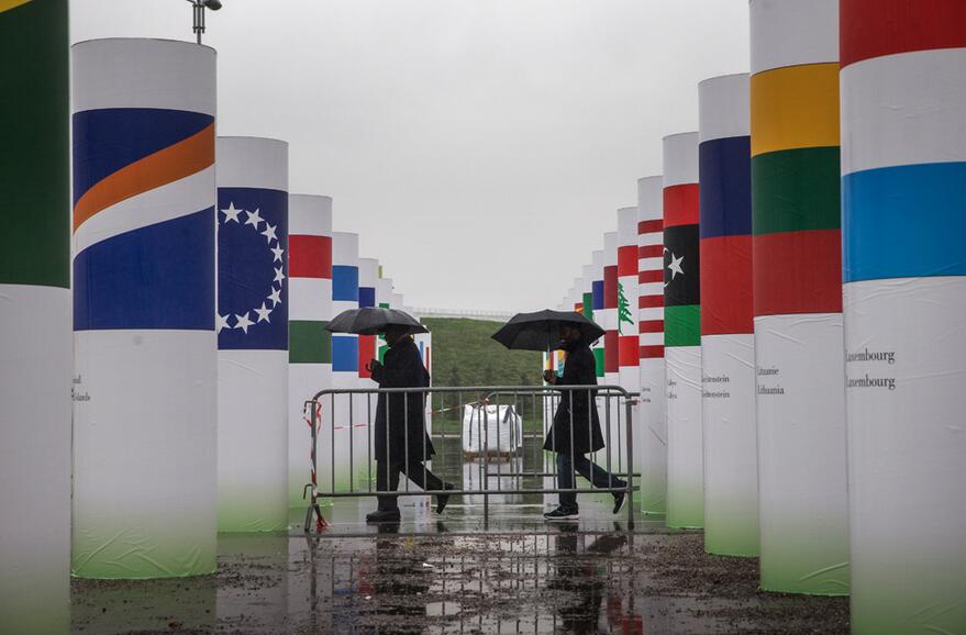 11月24日,行人走過巴黎氣候變化大會會場入口。新華社發(迪奧·杜瓦爾 攝)