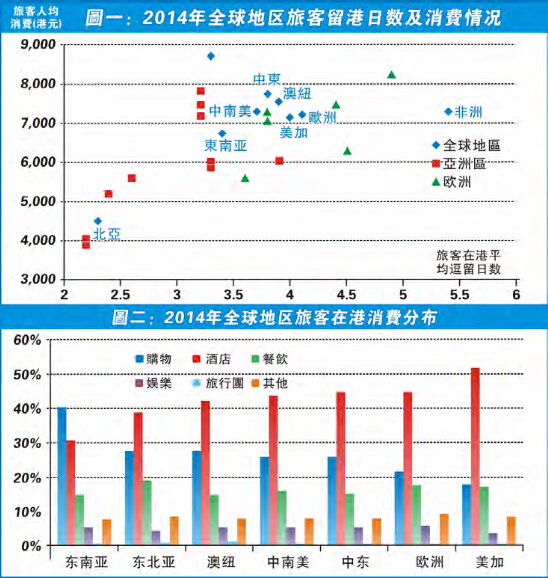麻煩是有,但未必不能解決。先看圖一,鄰近香港的東北亞(日韓)及東南亞旅客留港日數最短,平均只有2至3.5日,跟歐美約4日以至非洲旅客近5.5日有點距離。再對比旅客在港的人均消費,圖中見到留港日數較短的日韓及東南亞旅客,在港的總消費額都較少。反之,歐美及中東等留港時間較長的旅客普遍在港都較豪。由此可見,在港消費「有幾豪」除了與本身購買力有關外,逗留得愈久,花費明顯愈多。
