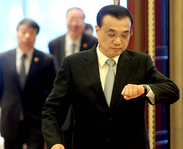 夜航從馬來西亞返回國內,凌晨兩點多才到達蘇州賓館,24日上午李克強總理立刻又進入“16+1”模式,密集會見中東歐領導人。“克強節奏”以分鐘計,名不虛傳。圖為見下一場外賓途中,克強總理邊走邊看手表。