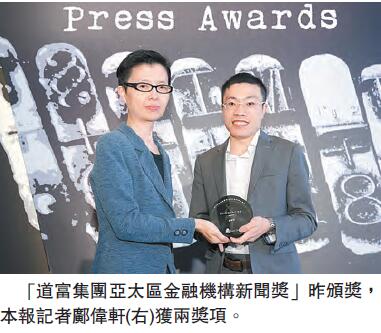 本报获奖报道合共4篇,分别题为《适时引入合夥人制度?科网上市更喜来港叩门》、《市场人士指保障未全面?港股冷静期应纳所有正股》、《高新科技投资?续领风骚》、以及《中国私募攻港?抢高9号牌价》。上述报道分别於今年4月29日、8月5日、1月14日及1月7日刊出。获奖记者邝伟轩表示,资本市场瞬息万变,投资者应关心股票市场的建构,以及资本市场以外的投资机会,期望未来可秉承本报「财经大报?商界平台」的口号,继续深入浅出向广大读者,就金融市场和宏观经济动向作出更精准的报道。