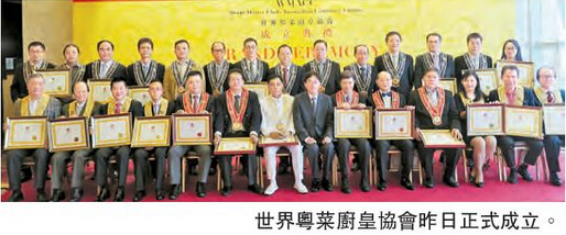 【香港商报网讯】记者余江强报道:世界粤菜厨皇协会经过两年多的筹建阶段,获得世界各地行业组织和华侨社团的支持,有超过24个国家地区的社团组织加入世界粤菜厨皇协会成为成员机构,覆盖区域包括亚洲、北美洲、欧洲和大洋洲。世界粤菜厨皇协会主席梁日东昨日在香港举行的成立典礼上宣称,粤菜的文化将展开崭新的一页。主礼嘉宾食物及卫生福利局局长高永文为世界粤菜厨皇协会就职成员逐一颁发证书和勋带,气氛热烈。
