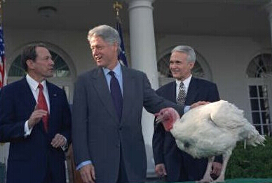 1998年感恩节,时任美国总统的克林顿在白宫玫瑰花园,赦免火鸡“杰瑞”。然而在这一年,克林顿却遭遇了一只不听话的火鸡。这只名为“杰瑞”的火鸡从饲养人沃尔特-吉斯拉森手上挣脱,在白宫草坪上乱跑一通,似乎不屑于被总统赦免。克林顿看着不老实的“杰瑞”,露出尴尬笑容。