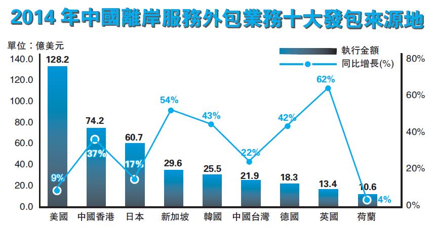 2014年,中国离岸服务外包业务十大发包来源地前三名依次是:美国,执行金额128.2亿美元,同比增长9%;香港,执行金额74.2亿美元,同比增长37%;日本,执行金额60.7亿美元,同比增长17%。此外,以知识和研发为核心的业务形态占比不断攀升。2014年,中国承接以知识和研发为主要特徵的离岸知识流程外包业务186.7亿美元,比重稳步提升的同时,推动中国服务外包产业向价值链高端延伸,I-TO、BPO、KPO齐头并进。