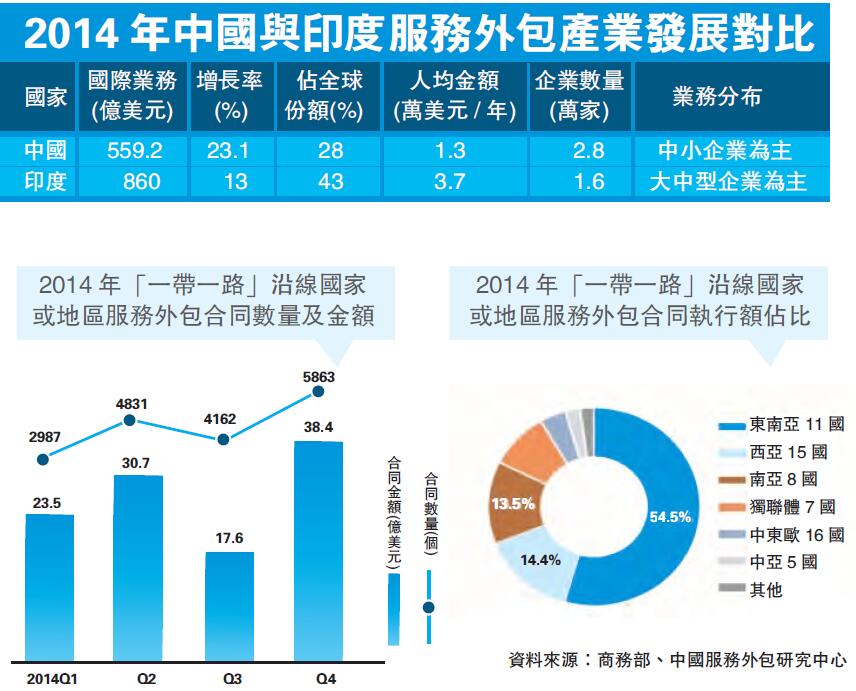 「一带一路」沿线国家和地区在服务外包领域存在广阔的合作空间。国务院发展研究中心专家王习农在2015全球服务外包大会上表示,「一带一路」沿线国家和地区不少已是全球服务外包中的活跃国家或地区,比如以印度为核心,包括中国、菲律宾、孟加拉、斯里兰卡、越南在内的南亚和东南亚地区是承接全球第一大离岸业务集聚区;以波兰、保加利亚、捷克为中心的中东欧地区,成为承接国际服务外包业务的另一重要集聚地;俄罗斯则凭藉其高科技人才在从事高端研发设计服务方面占有独特优势。随着中国加快向服务经济转型和推动制造业升级步伐,作为服务外包需求方的角色亦日益凸显,越来越多的企业在海外建立研发中心、设计中心、人才中心、谘询中心、财务中心、共享中心等。王习农表示,沿线国家和地区在建筑、交通运输、能源工业、电子通讯等领域的合作将带动相关后续服务,特别是生产性的运维服务和技术服务的出口,从而为推动服务外包产业发展提供持续动力。