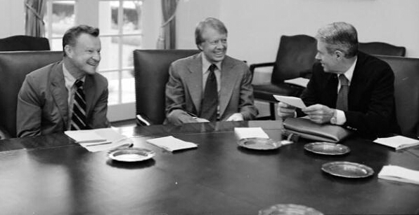 布熱津斯基(左)與總統卡特、國務卿瓦斯(右),攝于1977年。