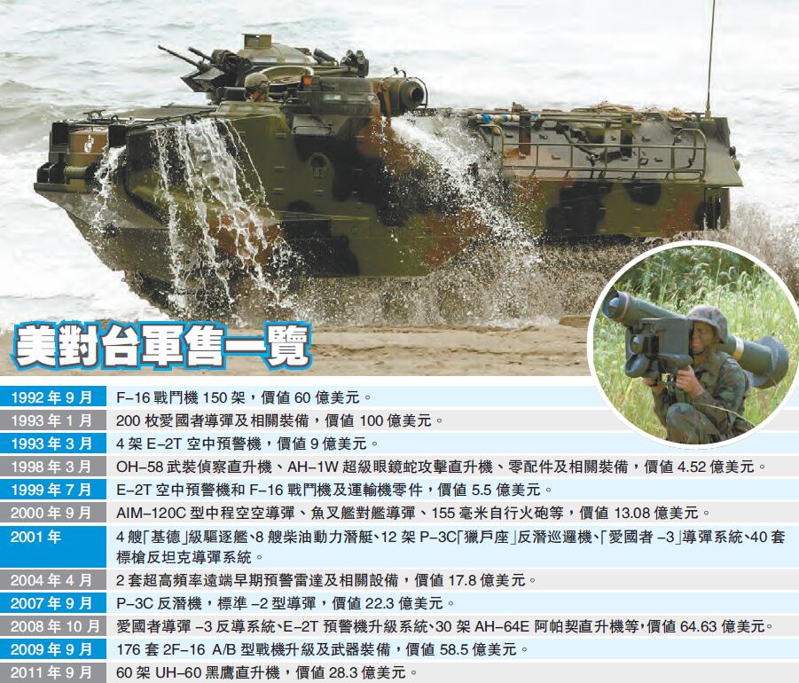 【香港商报网讯】彭博社美东时间25日报道,奥巴马政府将於12月中宣布对台湾约10亿美元军售案,包括12辆AAV-7两栖突击车(右大图)和反坦克标枪战防导弹(右小图)。台当局表示,欢迎美方履行安全承诺,提供必要防卫性武器及服务。不过,大陆国防部新闻发言人吴谦昨日重申,坚决反对任何国家向台湾出售武器。