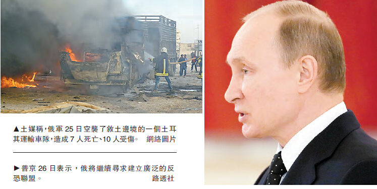 在俄外長拉夫羅夫作出「將不會對土耳其發動戰爭」的表態后,土運輸車隊在敘利亞阿勒頗省遭遇空襲,地面武裝分子和土官方都將施襲者指向了俄空軍。俞邃認為,IS本身和敘利亞反對派就交纏在一起,如果土派出的車隊支援敘反對派,因而遭受空襲很難釐清事實。「認為是俄報復行為是可以想像的,這個動作對於俄來說也不算很大的報復行為。」(香港商報記者 敖雷)