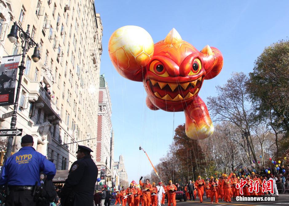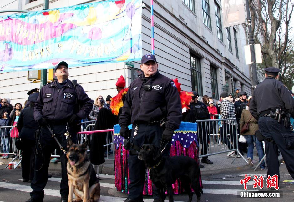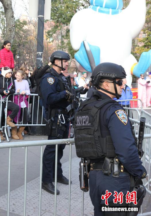 當地時間11月26日,紐約舉行第89屆梅西百貨感恩節盛裝大游行,估計有300多萬人在曼哈頓沿途現場觀看。紐約警方高度戒備,出動2500名警察沿途警戒,這也是梅西百貨感恩節大游行活動歷史上出動警察最多的一次。 中新社記者 阮煜琳 攝