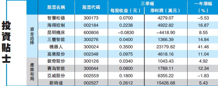 有券商研報指出,目前正在布局機器人產業公司有:如銳奇股份的機器人控制系統計劃明年達到800台至1000台產量;賽為智能正在進行水下機器人等特種機器人研究;亞威股份與德國庫卡開展機器人合作,訂單已開始交付;新時達擬定增併購兩公司,拓展機器人業務。