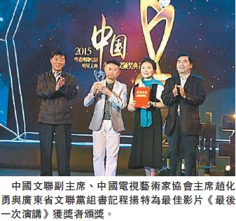 【香港商報網訊】記者蘇偉報道:由中國電視藝術家協會、廣東省文學藝術界聯合會和深圳市委宣傳部指導,廣東省電視藝術家協會主辦,深圳大道風文化傳播有限公司承辦的2015中國粵港澳微電影明星大典近日在深圳舉行了盛大的頒獎典禮。來自粵港澳三地的藝術家們與眾多微電影創作團隊獲獎代表共聚頒獎晚會,在萬眾矚目下共同見證了中國微電影「金種子獎」的絢麗綻放,向觀眾展示了視聽大餐。《最后一次演講》榮獲「金種子獎」唯一最佳影片。