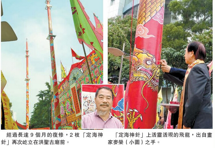 【香港商报网讯】记者王卓轩报道:始建於1773年,位於鸭脷洲洪圣街的洪圣古庙,被古物古蹟办事处列为一级历史建筑及法定古蹟。庙前竖有一对有「定海神针」之称,高约50尺、柱身绘有龙形图案的风水龙柱,其中一根去年9月遭台风「海鸥」吹倒。经过长达9个月的复修,全新的龙柱已加强地基巩固,可抵御强风。鸭脷洲街坊同庆公社昨日为洪圣古庙举行龙柱重修开光仪式及法事,以答谢神恩,祈求地方太平、风调雨顺。开光仪式吸引大批市民参与,现场气氛热闹墟溅。
