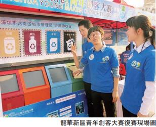 據了解,在當天的復賽現場,一排色彩鮮豔的垃圾箱引起大賽評委以及許多參觀市民的注意,一些好奇的小孩更是爭先咨詢如何操作。當「太陽能」+「智能」應用到垃圾分類上,於是催生了太陽能智能分類回收環保箱。這是由深圳市一家低碳環保志願服務協會展示的項目。該協會致力於推進城市生活垃圾分類減量工作,但在開展資源回收方面的工作中,遭遇無法確實有效掌握居民的「知曉率」、「準確率」、「參與率」及並使垃圾分類做到「常態化」問題。於是,太陽能智能分類回收環保箱應運而生。環保箱箱體由四個軟架與箱門鏈接組成,用手機掃描箱體二維碼,再點擊手機上顯示出的垃圾類型,箱門就會自動打開,數據也會即時傳送到電腦系統。系統根據投放數據給予用戶相應的獎勵。據項目團隊負責人介紹,環保箱不僅可解決城市垃圾管理分類的處理系統問題,同時可通過對人的生活習慣進行分析,並利用大數據「物聯網」概念,對城市管理產生積極影響。值得一提的是,本屆賽事的最大亮點就是「創客導師」和「創客訓練營」的賽程安排。賽事組委會面向全市招募了100名優秀的「創客導師」,每一個參賽項目均配備一名創客導師,全賽程跟蹤項目,協助尋找隊員、解決問題、撰寫計劃書,激勵創客團隊將種子想法、創意和構思變成可以展示的具有真實價值的產品。
