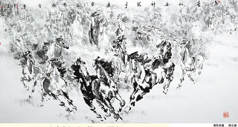 陳石先生生肖屬馬,亦酷愛畫馬,很早就以畫馬馳譽黔境。馬,是中國畫家自古以來就鍾愛的題材,歷代名家輩出。所以,學會畫馬,并不算很難,但要畫好馬,并且力邁前賢就不容易。陳石先生畫的馬,驍騰神駿,氣勢逼人,在中國的畫馬藝術中另辟一格。我曾親眼見證先生畫馬,只見先生操筆在手,凝思片刻,便奮筆直下,初始時以長線鉤形,繼而點畫并作,仿佛腕底挾持風雷,運筆越來越快,暴風驟雨之際,一群神駿便撲面而來,神駒姿態各異,然均神勇奔猛。當年杜甫詠嘆曹霸畫馬時——「斯須九重真龍出,一洗萬古凡馬空。」陳石先生畫馬的場景,酷似盛唐畫馬聖手曹霸創作情景的復現,給人帶來的現場震撼,非親歷者不足與道也。陳石先生畫馬不僅神速,而且準確,這固然得益於先生數十年如一日的潛心練筆,但少為人知的是,先生對馬的研究花的功夫之多,渾然不亞於其筆耕的功夫。先生嚐自言:「我首先必須研究馬的結構,了解一些解剖學知識。比如說馬腿的上半截,也就是相當於人的大臂這兒,其實是包在胸脯里的。馬的四個指頭也退化了,只有中指露在外面。所以,馬使的是『一指功』!」如此精確的觀察和剖析,沒有長年累月的寫生和觀察積累,是不可以想象的。盡管觀察入微,解析到位,但陳石先生畫的馬,卻不能歸於寫實一類,而是地地道道的大寫意。世間對寫意畫如今誤解頗多,以為寫意就是隨意,中國的寫意畫越來越亂,幾乎淪為亂涂亂抹的代名詞了。陳石先生的寫意馬的出現,頗有正本清源之意。在陳石先生的畫室里,四處堆放著他的練習作業,大的至丈,小的過寸而已,雖然姿態面目各不相同,但任何一個姿態都經過了畫家的千百次打磨。在我看來,先生的幾筆寫意畫,很像賈島的苦吟詩——「二句三年得,一吟雙淚流。」誰能知道,畫家為了風馳電掣的幾筆,兀兀窮年,蚌病成珠,一點一線,如金剛運杵,萬毫齊力,非可等镕視之也。近代寫意畫巨擘張大千曾一語道出寫意畫的真諦:寫意兩個字,依我看來,寫是用筆,意是造境,不是狂涂亂抹的,也不是所謂文人遣興,在書房里用筆頭寫寫的意思。作畫自然是畫卷氣為重,但是根基還是最要緊的。若不從臨摹和寫生入手,那麼用筆結構都不了解,豈不是大大錯誤,所以非下一番死功夫不可。陳石先生的如山畫稿與成冢禿毫,見證他的神駿不是從天而降,而是青燈面壁的苦修而來的。先生不嗜他好,唯於藝術一途不舍不棄,業餘時間亦不治他技,幾十年浸淫筆翰,歌於斯,哭於斯,唯為神駒著迷。先生以草書筆法入畫,無一筆茍且,亦無一筆松懈。人家說先生畫的馬乃筆墨精熟而成,我更願意說先生的馬是心血孕育而成。