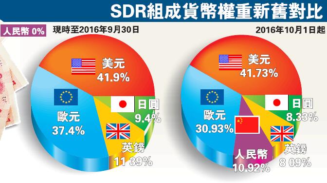 當地時間11月30日,IMF在其執行董事會會議上宣布將人民幣納入SDR貨幣籃子;新的SDR貨幣籃子將於2016年10月1日起生效。據悉,人民幣在SDR內權重佔比將達10.92%,超越日圓及英鎊成為SDR第三大貨幣,亦是SDR內的第五種貨幣。