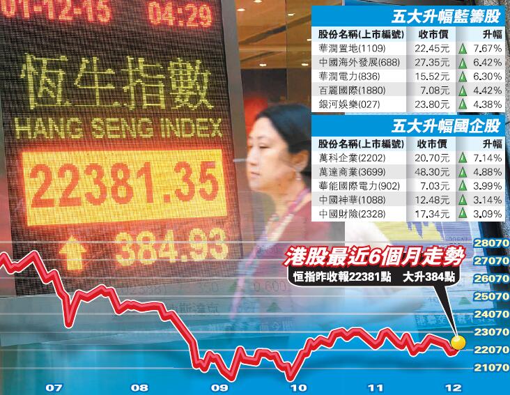 【香港商報网訊】記者伍敏報道:12月份基金「粉飾櫥窗」效應乍現,港股昨日在人民幣納入特別提款權(SDR)籃子貨幣刺激下高開200點后反覆造好,即使同日公布的中國11月PMI創逾3年低位亦無阻升勢。恒指六連跌后反彈,收市升384點或1.7%,報22381點,收復50日線(22371點);大市成交805億元。