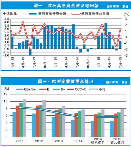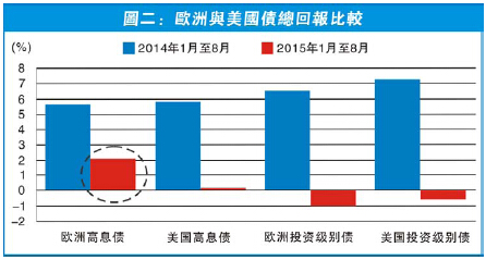 不過,最令筆者擔心的是,圖二見到,截至今年8月底,歐洲高息債的總回報只有約2厘,遠低於去年同期的近6厘。沒錯,今年年中炒希臘差點退歐,歐債表現不佳不足為奇。但大家有否留意,以歐洲高息債債息平均約6至8厘計算,基本上今年價格已跌,現時仍有約2厘的總回報只因為息高才有錢賺。更何況,資金流走的情況不是今年才發生,去年歐洲高息債的總回報約6至7厘,一眾資金已經不再戀棧。
