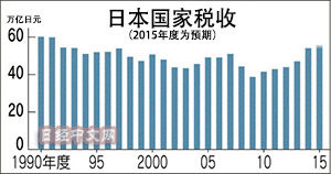 日本國家收稅在1990年度創下歷史最高記錄,達到60.1萬億日元,1991年度為59.8萬億日元。經濟泡沫崩潰后,稅收持續減少,2009年度跌至40萬億日元左右。在安倍第二次上臺執政的2012年度,稅收為43.9萬億日元,3年時間增加了12萬億日元以上。日本財務省7月匯總的2014年度稅收較1月份的預測多出2.2萬億日元。當時財務省認為2015年度稅收將會增加1.2萬億日元。但夏季以后稅收進一步上漲,目前正在商討上調事宜。
