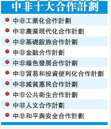 習近平表示,為推進中非全面戰略合作夥伴關係建設,中方願在未來3年同非方重點實施「十大合作計劃」,即中非工業化合作計劃、農業現代化合作計劃、基礎設施合作計劃、金融合作計劃、綠色發展合作計劃、貿易和投資便利化合作計劃、減貧惠民合作計劃、公共衛生合作計劃、人文合作計劃、和平與安全合作計劃,著力支持非洲加快工業化和農業現代化進程,實現自主可持續發展。