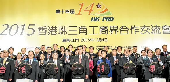 由香港工業總會、香港生產力促進局及珠三角工業協會舉辦的第14屆香港珠三角工商界合作交流會,昨日在江門市舉行。梁振英在千人宴上致辭時,對香港工業的重要性予以肯定。他說,香港的工業是香港經濟的一個重要組成部分,雖然生產行為往往在香港以外的地方,但仍然是香港經濟組成的一個重要部分,十分值得政府和社會繼續重視。