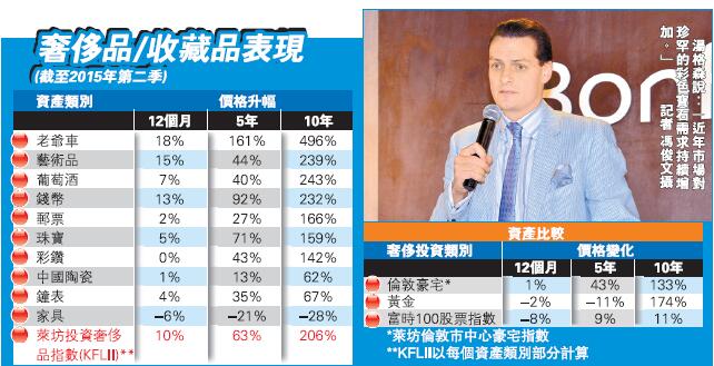 全球經濟放緩,但多數高端奢侈品(紅酒、老爺車及珠寶)價格,不減反增。過去一年中(即截至今年9月的過去12個月),老爺車表現最好,價格上漲18%,藝術品也錄得15%的增幅。