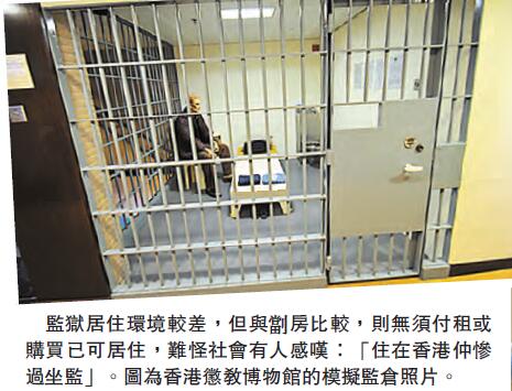 对比之下,香港惩教署单人囚室面积约80平方尺,间隔方正,配备胶床、胶齘、一套独立不锈钢坐厕连洗手盆及洒水系统,囚室虽小五脏俱全,居住环境明显超越居住在浻房或者高级浻房里的港人。