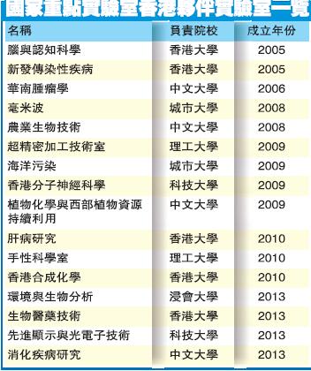 國家科技部自2005年起,與香港城市大學、香港浸會大學、香港中文大學、香港理工大學、香港科技大學和香港大學等6間大專院校合作,成立16間國家重點實驗室夥伴實驗室,其中12間在2010年或之前成立;另外4間則於2013年成立。國家工程技術研究中心首間香港分中心早在2012年成立,國家科技部今年10月再批準興建多5間香港分中心,昨日於沙田科學園舉行揭幕儀式,主禮嘉賓包括萬鋼、中聯辦副主任仇鴻及楊偉雄等。
