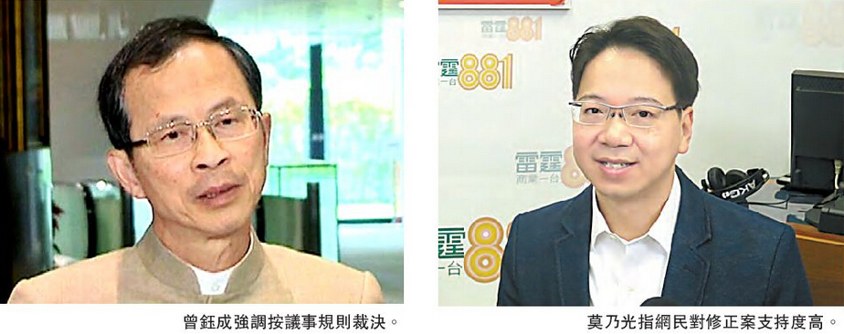 曾钰成则希望,议案辩论能於下周完成,但强调不会就此设立死线。对於有团体指会在议案审议期间在立法会外集会,曾钰成表示,立法会有丰富经验应对扰乱秩序的行为,保障大楼使用者安全,若大楼安全受威胁,他会要求警方协助维持秩序。