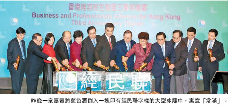 经民联於晚宴开始前,特邀一众嘉宾上台,将蓝色酒倒入一块印有经民联字样的大型冰雕中,寓意「常满」,及后众人更举杯祝酒,祝愿经民联再接再厉,屡创佳绩。经民联主席梁君彦致辞时表示,作为只成立仅仅3年的政团,经民联不单既年轻亦充满活力,亦深入社群带动年轻人。他指出,香港是多元化社会,存在许多不同声音,但监於香港近年呈现跌势,加上创新力不足,不符合社会变化等等,都在削弱香港竞争力,情况令人忧心。