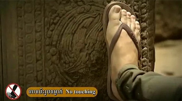 这个两分钟的视频展示了坐在大象上的柬埔寨国王目睹吴哥窟游客一系列不合规范行为而感到不忍直视的过程。其中提到的行为包括着装暴露、用自拍杆与和尚拍照、给小孩钱、触摸寺庙浮雕以及乱扔垃圾等。