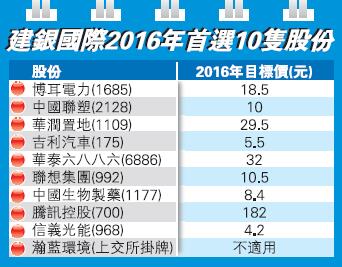 建銀國際2016年首選10隻股份,均予以「優於大市」投資評級,包括博耳電力(1685)、中國聯塑(2128)、潤地(1109)、吉利(175)、華泰六八八六(6886)、聯想(992)、中國生物制藥(1177)、騰訊(700)、信義光能(968)及上交所的瀚藍環境。