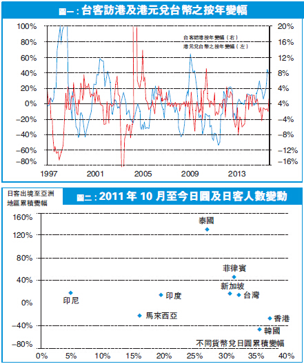 內地客以外,台灣訪港旅客佔了最大比重。但自有記錄的1997年起至今,台客訪港與港元兌台幣的按年變幅計算相關系數,只有-0.14,意味著匯率變化與旅客訪港興趣沒有太大關系(見圖一)。放諸其他亞洲地區,只有韓國有較高的負相關性,為-0.34,其餘日本為-0.15,菲律賓-0.02,泰國-0.14,而新加坡、印度及印尼等更差不多是無關系。如是者,匯率高就趕客、匯率低就吸客嗎?似乎不一定。