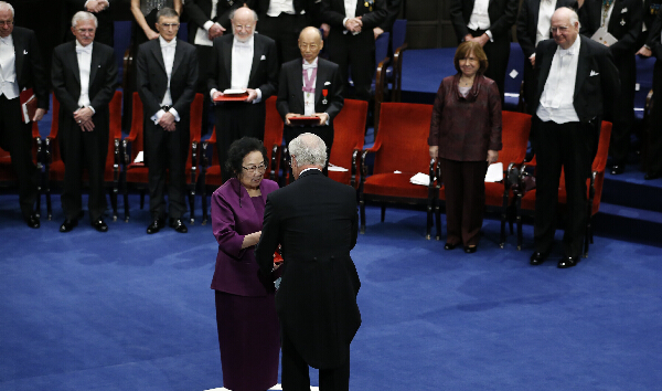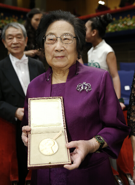12月10日,在瑞典首都斯德哥尔摩音乐厅举行的2015年诺贝尔奖颁奖仪式上,中国科学家屠呦呦从瑞典国王卡尔十六世·古斯塔夫手中领取诺贝尔医学奖。