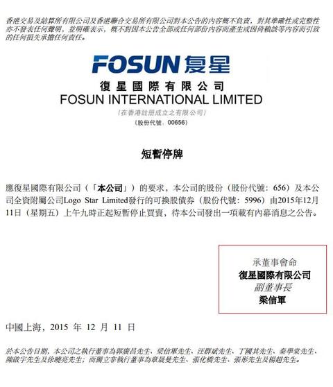 港股復星國際12月11日晚間公告,公司董事長郭廣昌現正協助相關內地司法機關調查。郭先生可以以適當方式參與公司重大事項之決策。本公司目前運營一切正常。公司股票2015年12月14日(星期一)上午九時正起恢復買賣。公告最后署名已是復星國際董事長郭廣昌,而昨日上午公司發布臨時停牌公告時的署名是副董事長梁信軍。