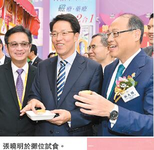 之後,張曉明來到國家旅遊局攤檔,了解內地派員參展宣傳旅遊業情況,並到美食廣場觀賞了香港小食。