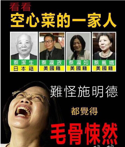 黄安微博:自从我专业打击台独后,台独骂我最多的就是卖台!先不说我一个老百姓如何卖台,至少我全家十几口人都在台湾生活。按照民调,民进党蔡英文当选“总统”已无悬念。可是就这个口口声声骂别人卖台的“蔡总统”,爸爸是日本籍、哥哥是美国籍、姐妹都是美国籍,尼玛的全家有一半都是外国人,你爱台爱个屁啦!