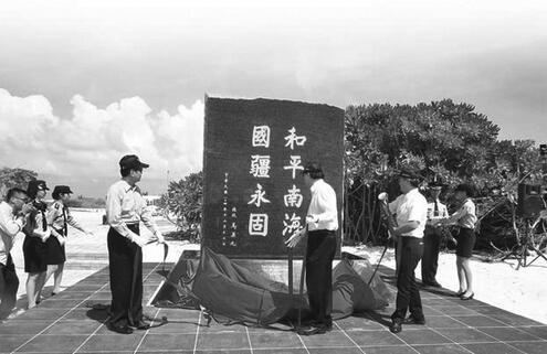 12日是台湾收复太平岛69周年纪念日,除太平岛灯塔、码头启用外,马英九落款的纪念碑也首度亮相。据台湾《中国时报》13日报道,马英九在碑石上亲题“和平南海、国疆永固”八个金色大字,并有“总统马英九”的中英文署名;碑石后面刻有南沙太平岛码头整建纪要,述及太平岛码头可供3000吨船舰停靠,灯塔能有效提供渔业协助与人道救援。 马英九在整建纪要中称,南海诸岛及周边海域是“中华民国固有领土及海域”,当局将秉持“主权在我、搁置争议、和平互惠、共同开发”的政策,致力打造太平岛成为和平、生态与低碳之岛。他还提到,太平岛是南沙群岛中面积最大且唯一拥有淡水的自然岛屿。