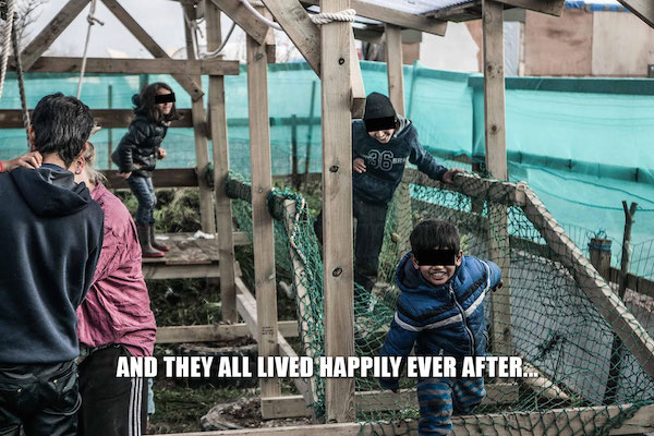 这幅肖像被画在难民营的墙面上,乔布斯依旧穿着人们所熟悉的黑毛衣、牛仔裤,他的右手拎着苹果最早的一代机型,肩上背着一个小包袱。班克斯的官网在上周五发布了现场的照片,并且在附言说:这是一个叙利亚移民的儿子。 乔布斯的传奇故事已经传遍全球,他的养母是亚美尼亚移民的后代,而他的生父是一位叙利亚移民,在二战之后来到美国定居。 配合这幅作品,班克斯难得地发表了一份声明:我们通常认为,接纳移民会导致国家资源被占用,但史蒂夫·乔布斯是一个叙利亚移民的儿子。而苹果是全世界最赚钱的公司,它每年上缴超过70亿美元的税金——而它能够存在,是因为他们接纳了一个离家的年轻人。 泰奥多尔·席里柯1819年的作品《美杜莎之筏》已经成为代表难民困境的经典图像,班克斯将其搬到了加莱的墙面上。在这艘备受死亡威胁的难民船的不远处,一艘豪华游艇正悠然远去。“我们并不在一条船上。”艺术家网站的图片说明一针见血地写道。 在港口附近,班克斯留下了另一幅图像,一个孩子拿着望远镜眺望远方,而秃鹫正站在望远镜上对这个孩子虎视眈眈。 今年夏天,班克斯在英国兴建了临时性的“迪斯马乐园”(Disamaland,黯淡乐园),吸引大批游客前往。在乐园里,他设置了一件大型装置,是装满尸体的船只。 9月,乐园结束营业后,班克斯安排剩下的基础设施搬挪到法国加莱地区,为7000名移民建立临时住房。这里的难民主要来自叙利亚、厄立特里亚和阿富汗,他们而今生活的地方之前是一片垃圾场。 “从此以后,他们都幸福快乐地生活着……”班克斯的团队在法国加莱设置移民临时住房时记录下了他们的生活场景。 班克斯在难民聚居区的另一面墙上潦草地写道:“也许整个情况会自行了结。”