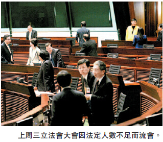 更離譜的是,反對派不單拖,更會賴,竟將流會的責任賴在建制派沒有為出席會議「編更」,賴在政府沒有派「狗仔隊」確保有足夠議員開會。難道建制派有編更,反對派就可以不出席會議?政府有狗仔隊「催」議員開會,反對派就會乖乖出席會議?說穿了,反對派總是想通過點算法定人數,達致流會和癱瘓議會運作的目的。