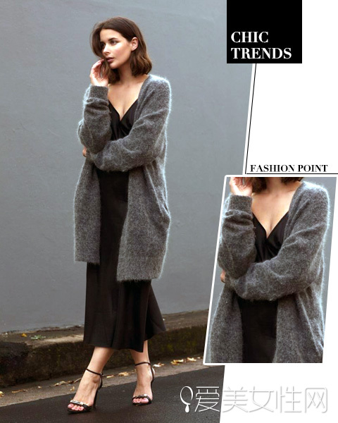 长毛衣外套搭长裙满满的女人味,稳重的深灰和黑色低调优雅,小露肉性感显瘦~