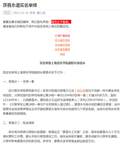 廖昌永微博写道:今天在网上发现一个实名举报我的举报信,并接到众多网友的关心,我首先声明这个举报是严重失实的;我个人已向党委及有关部门作了汇报,并愿意接受组织核实;另外,我已聘请了上海着名的周天平大律师,通过法律途径维护我的权益,并希望通过法律手段把造谣中伤者绳之以法!