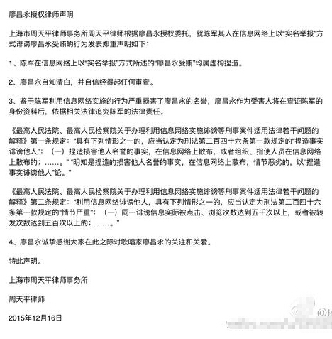 3、鉴于陈军利用信息网络实施的行为严重损害了廖昌永的名誉,廖昌永作为受害人将在查证陈军的身份资料后,依据相关法律追究陈军的法律责任。